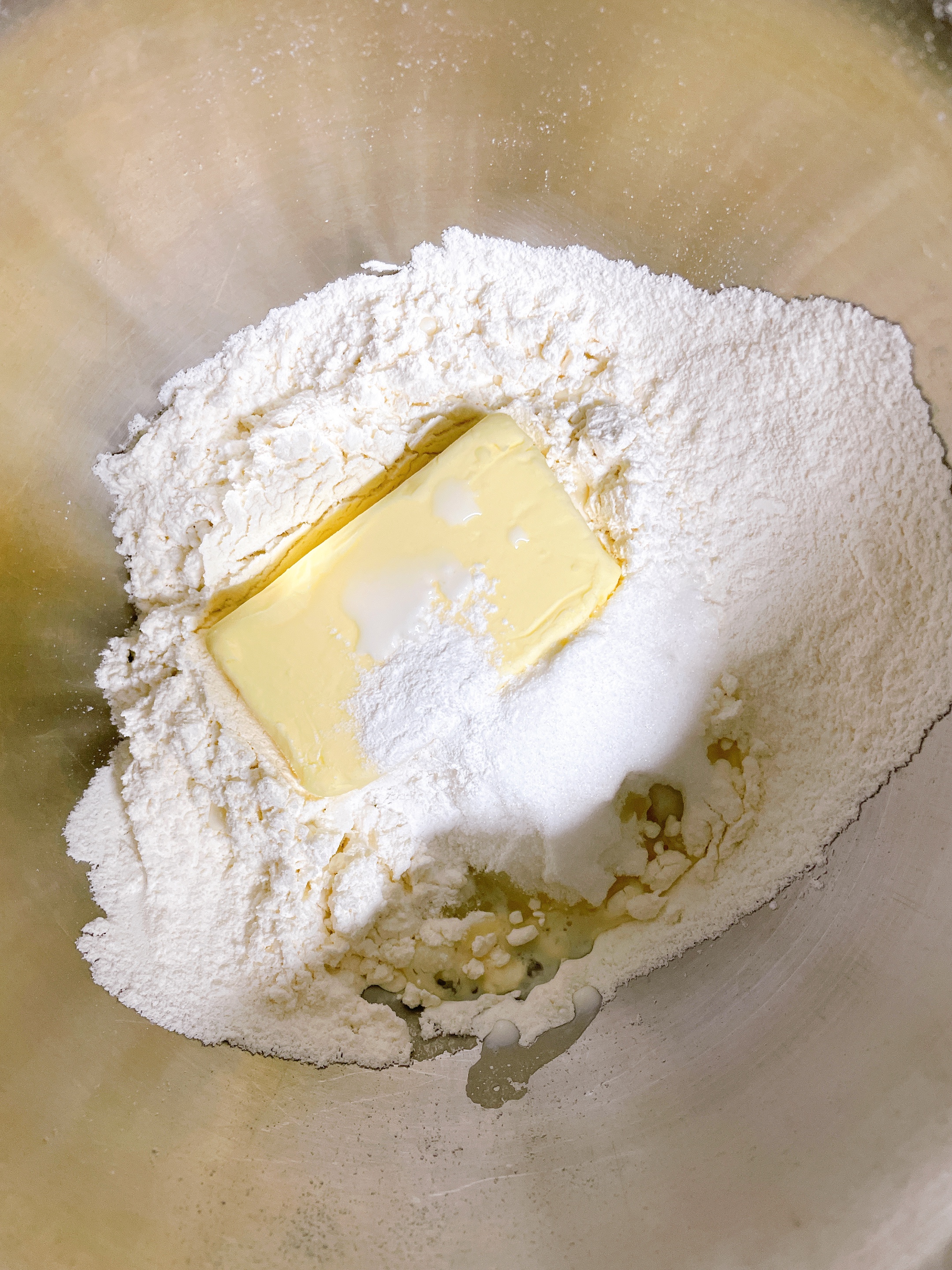 박력분 + 버터 + 설탕 + 소금 + 베이킹파우더를 모두 한꺼번에 넣고 잘 섞어준다.