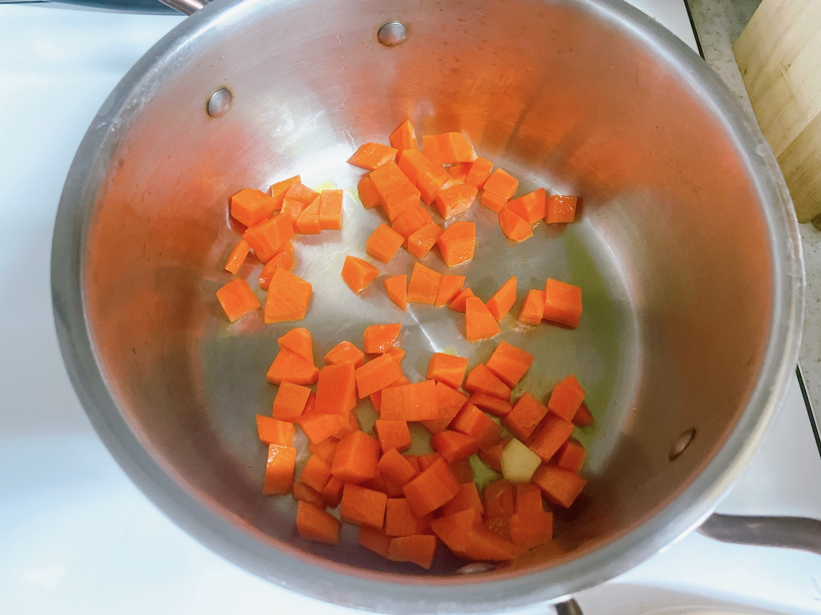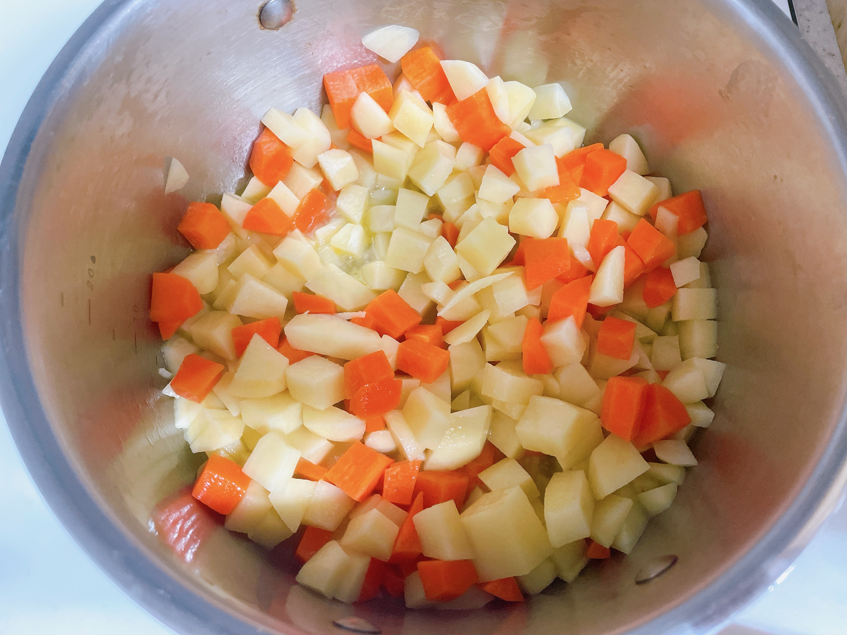 다 썰어주셨으면 냄비에 오일을 살짝 두르고~ 당근 부터 투척합니다. 당근넣고 사알짝 볶고 1분정도~ 볶고 감자도 넣어주세요.