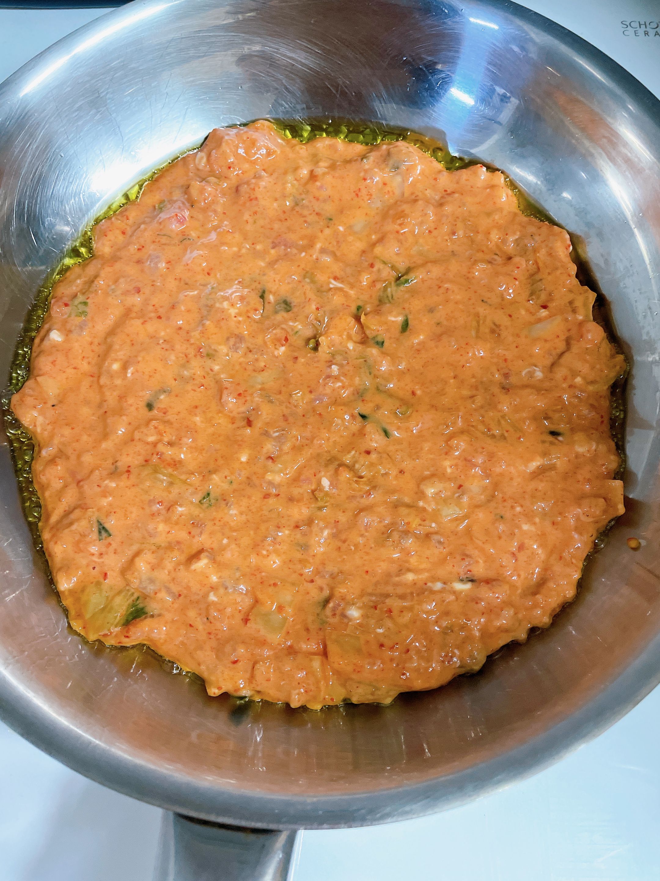 그렇게 내용물을 버무려주시고 나면 후라이팬에 기름을 두르면 되는데! 여기서 중요한게 있어요..