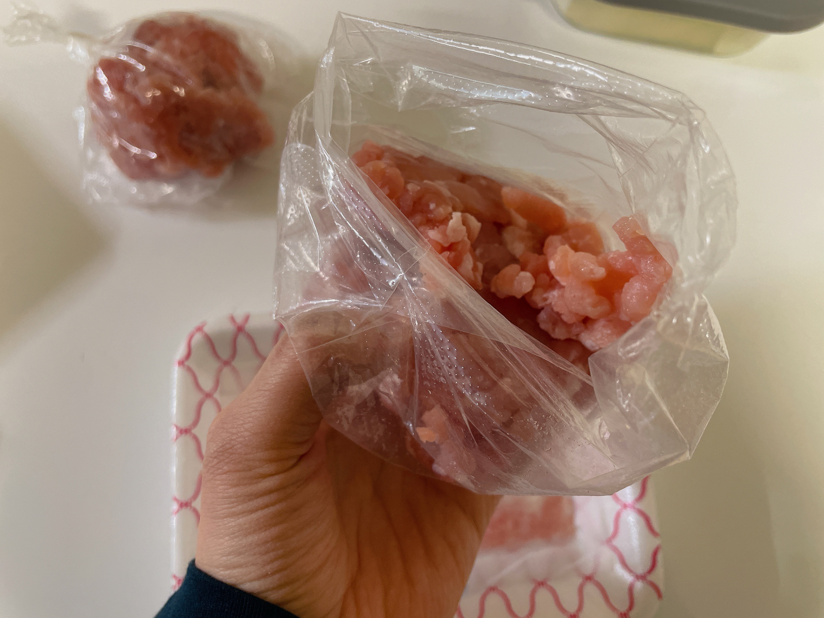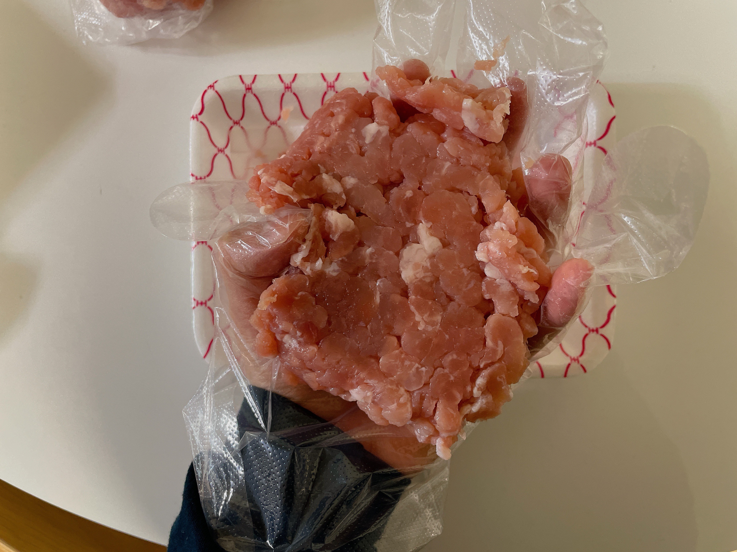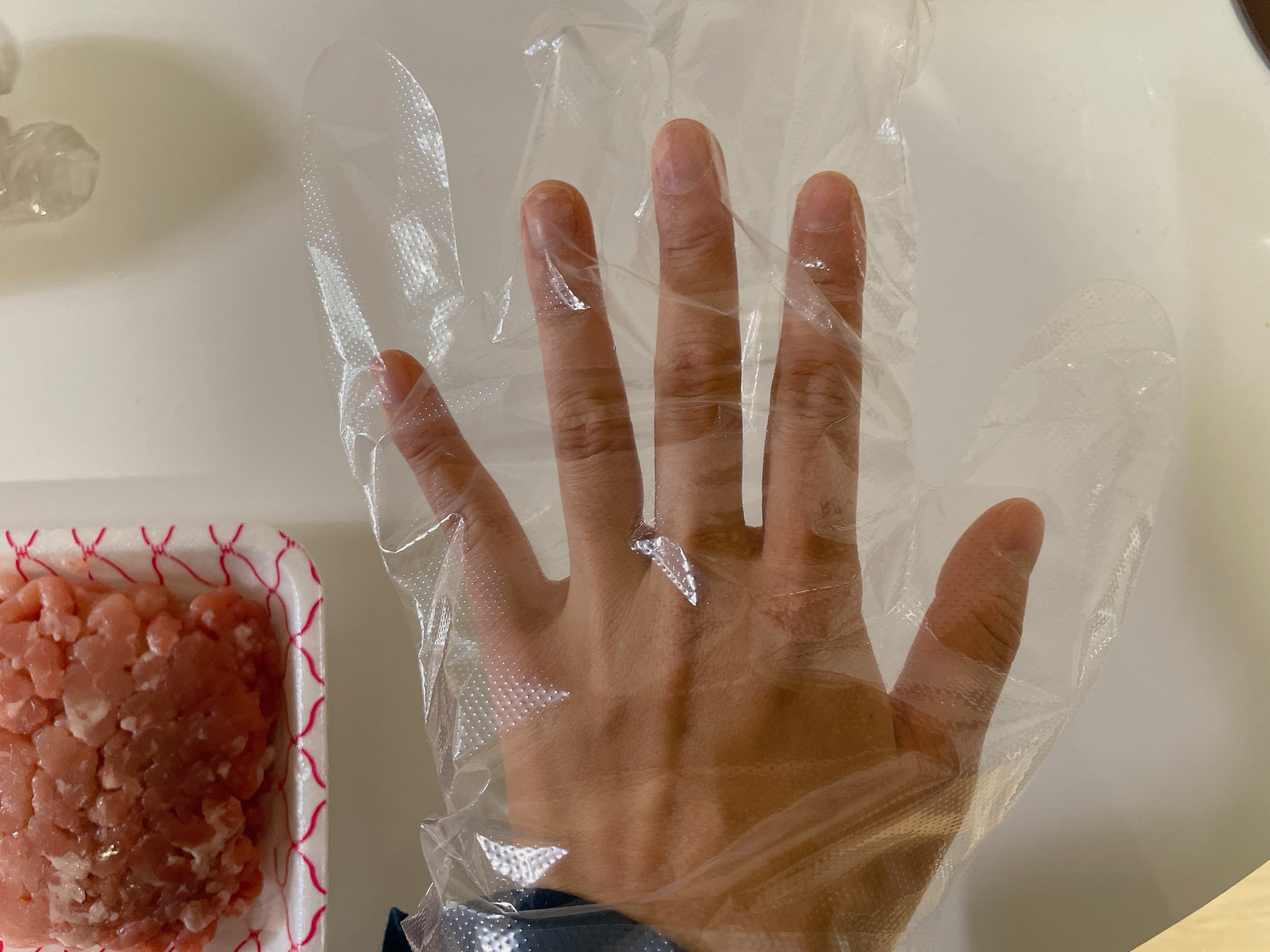 2. 장갑을 끼고 고기를 소분할 양만큼 잡는다.