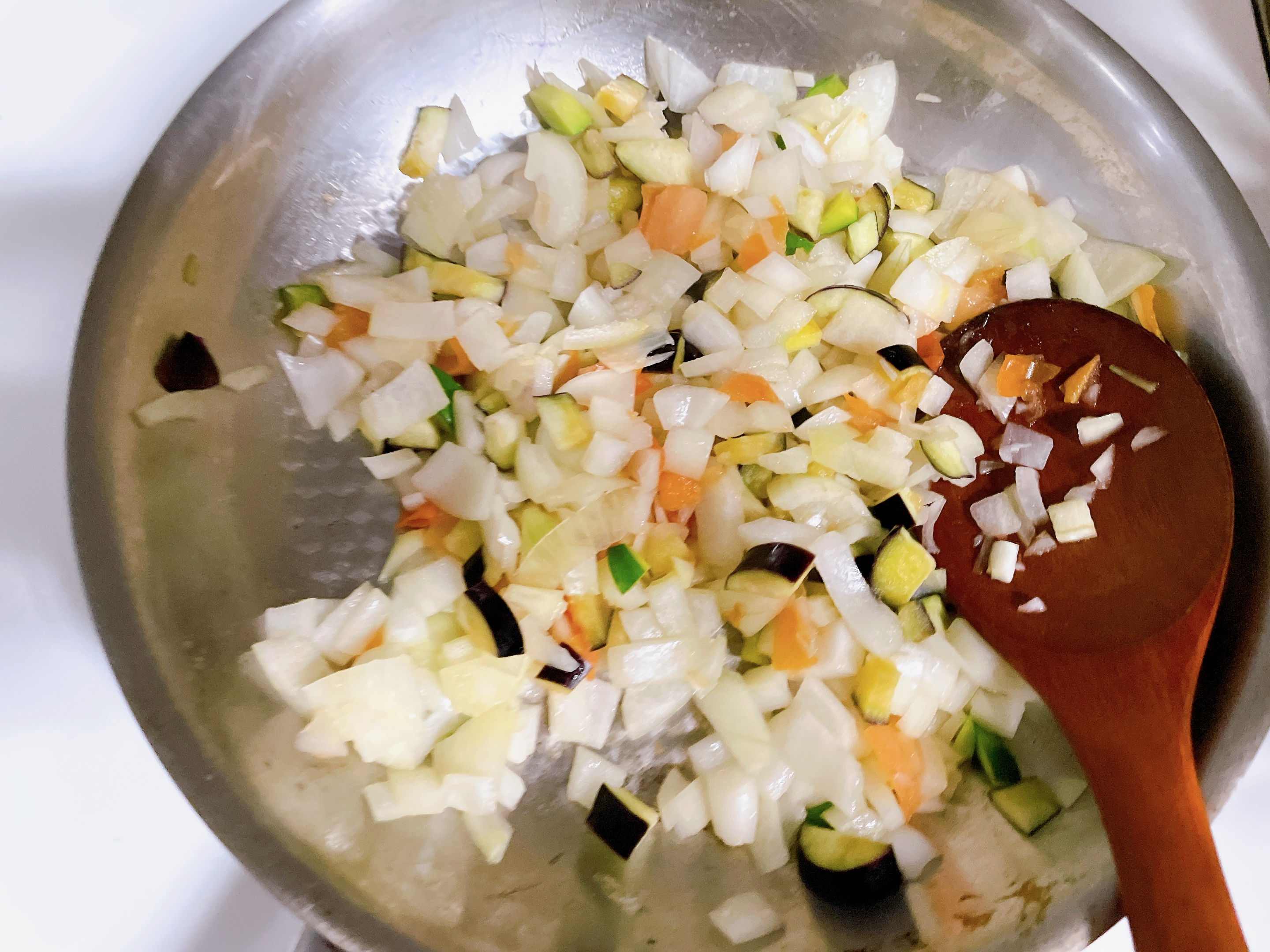 기름을 두르고~ 양파와 남은 자투리 가지와 호박, 토마토를 넣고 볶아준다음 토마토소스를 넣어준다.
