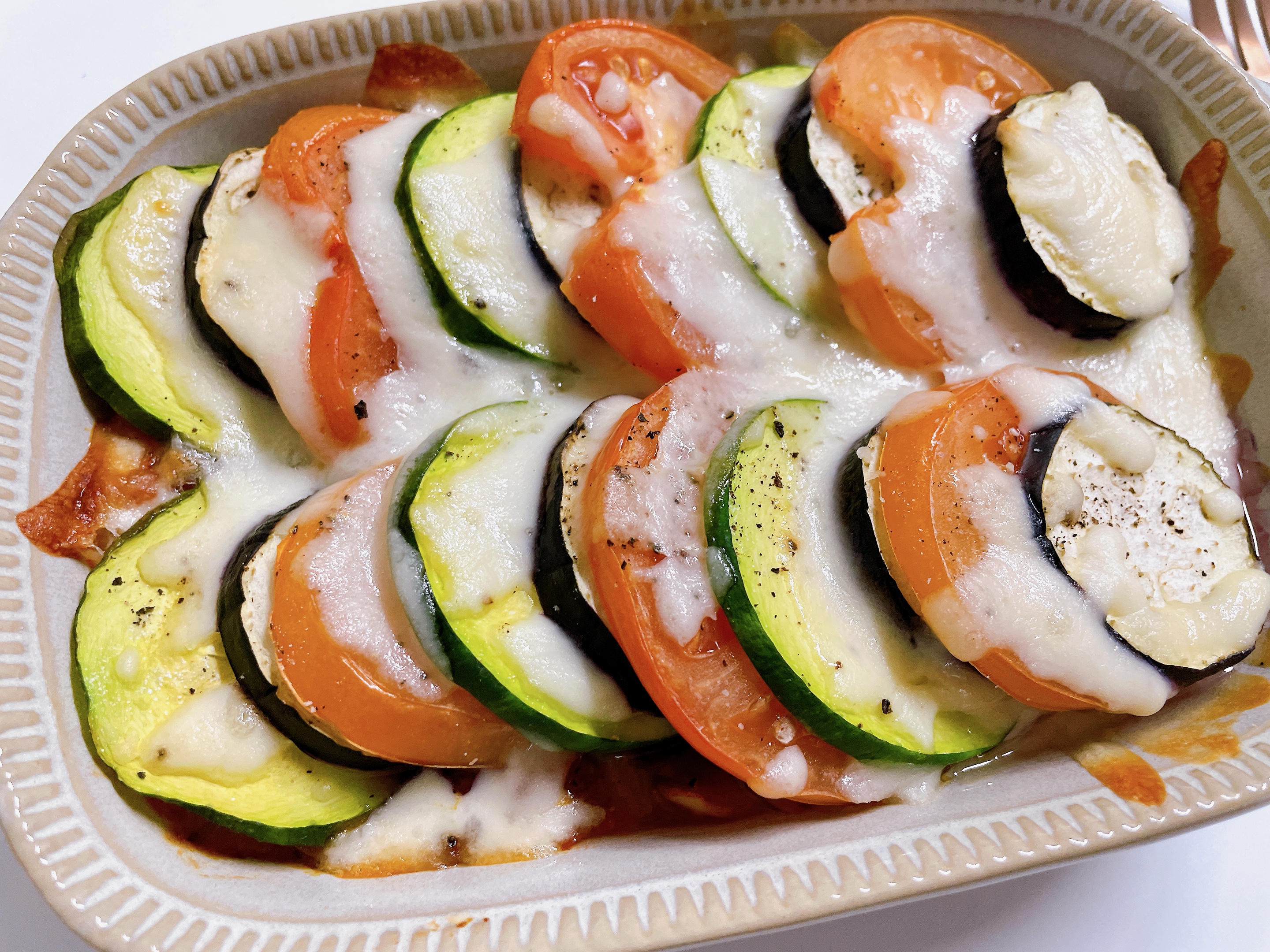 그리고나서 접시에 예쁘게 담아준다. 그리고나서 위에 아까 썰어두었던 호박-가지-토마토 순서대로~ 차곡차곡 예쁘게 쌓아준다.
