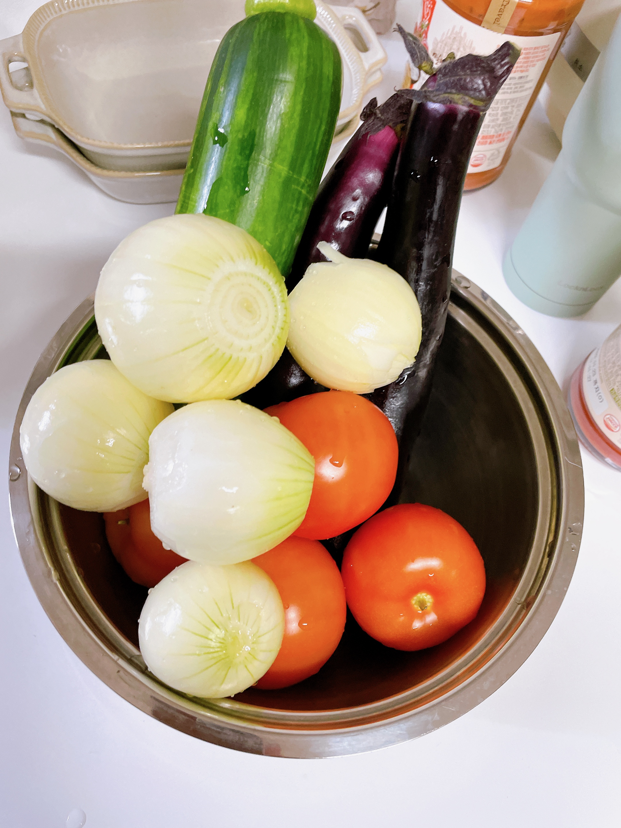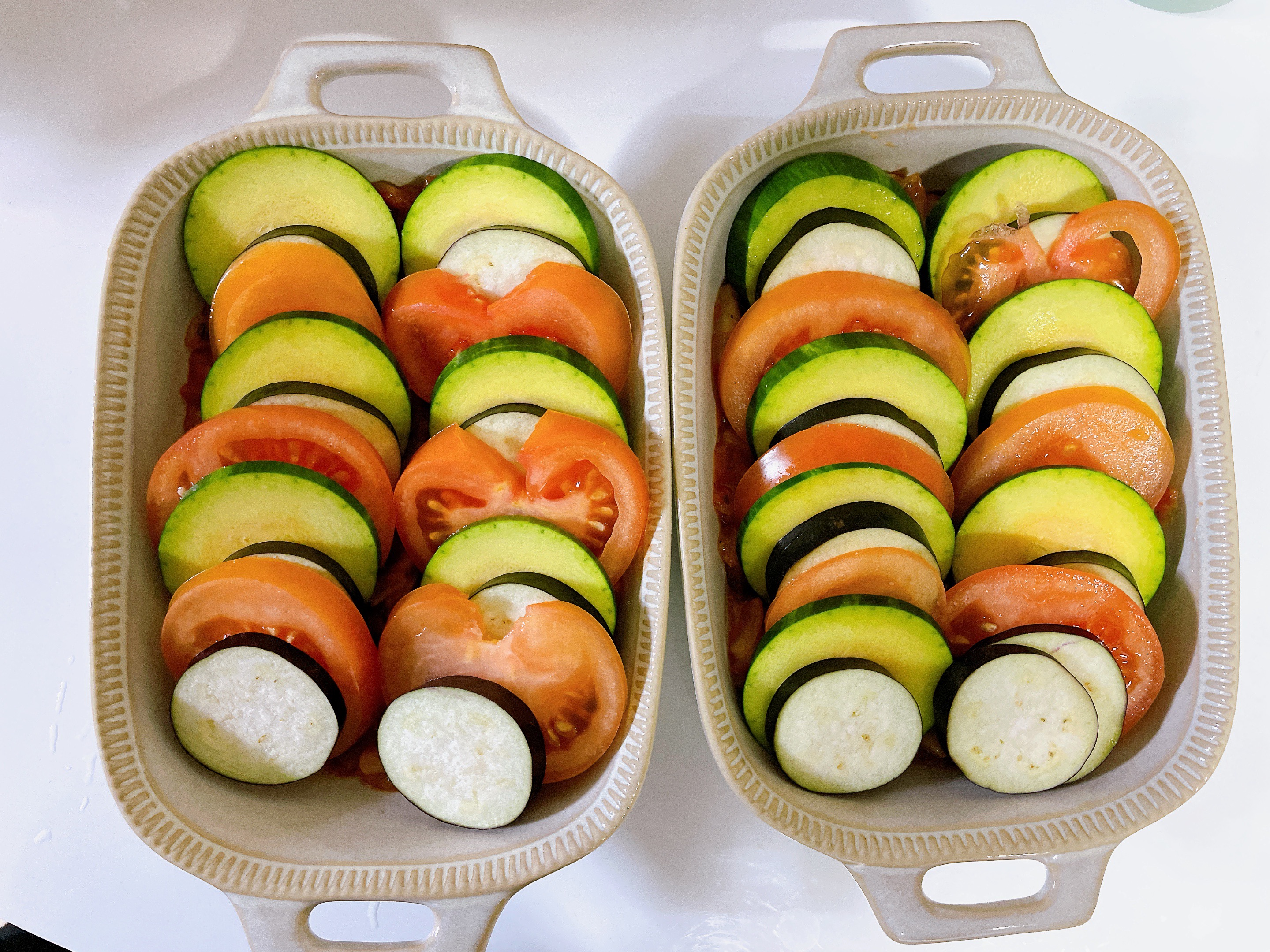 호박,가지,토마토는 사실 같은 두께로 썰어주면 나열했을때 더욱 예쁘다. 하지만 나는 칼질을 썩 잘하지 못해서..토마토가 아주 두껍게 썰렸다. 히히