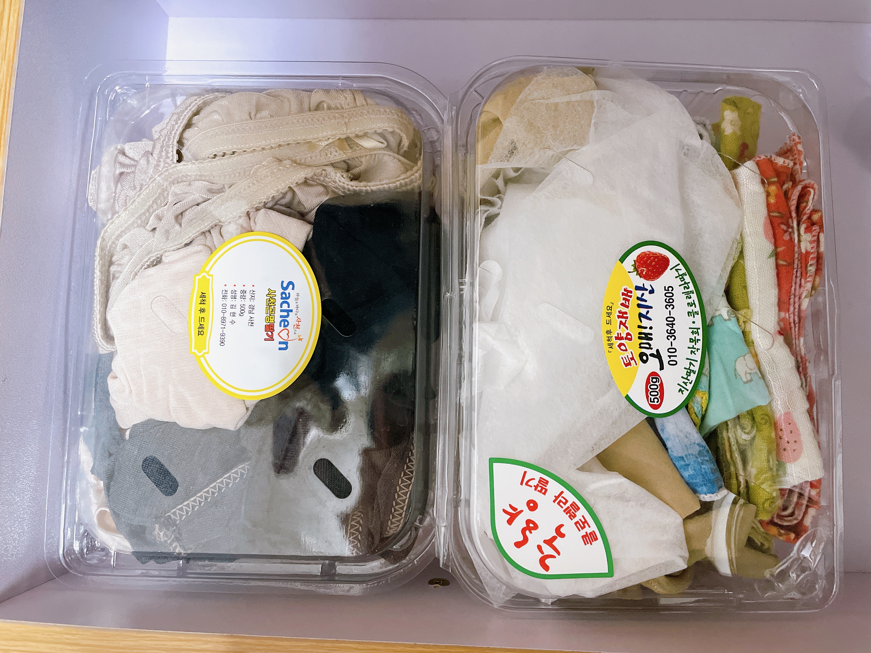 그리고 손수건과 화장후에 옷 입을때 쓰는 페이스 커버 같은것도 플라스틱 통에 넣어뒀어요.