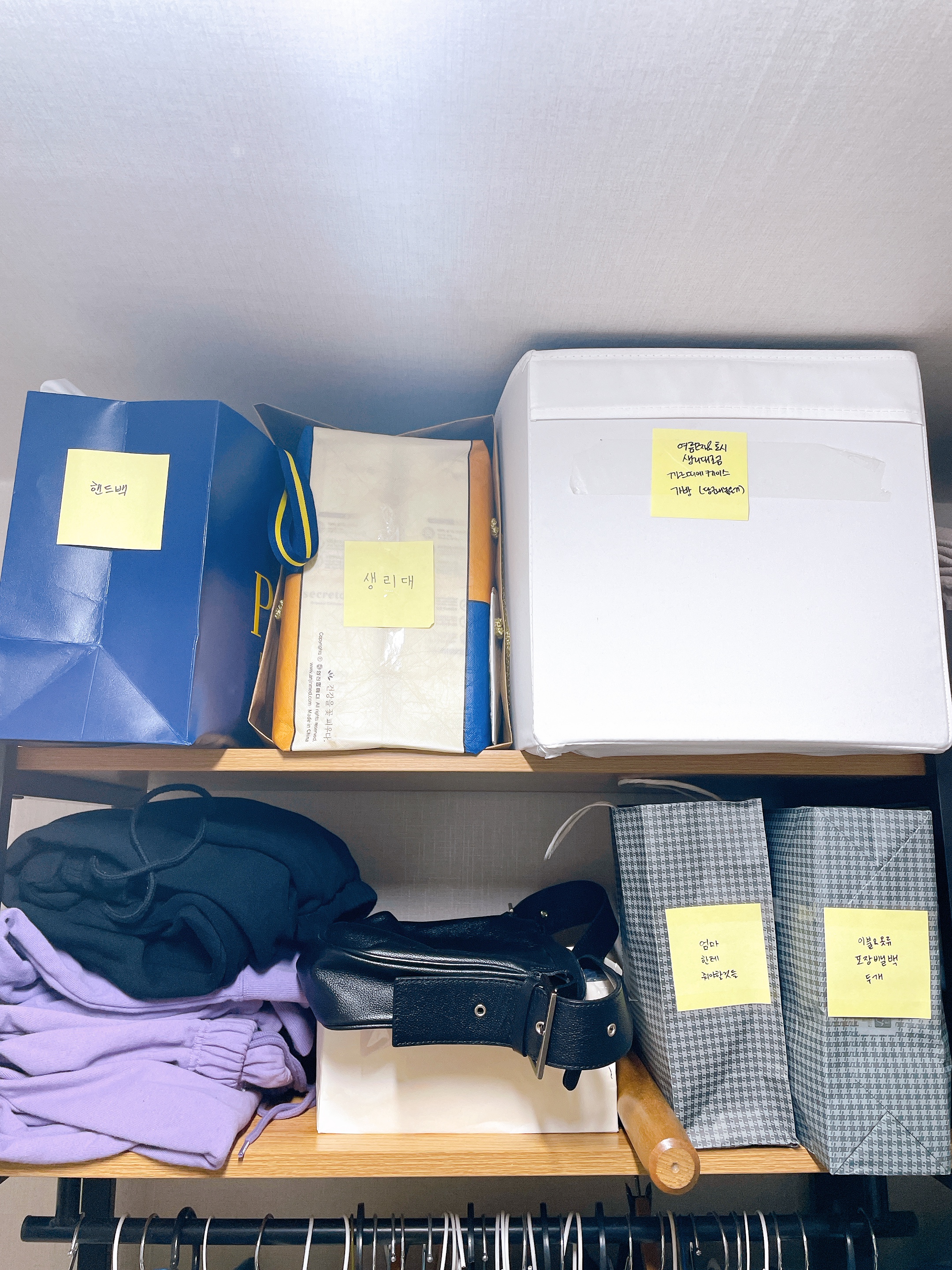 빳빳하게 안쓰는 브랜드 쇼핑백 안에 담아두고 겉에 포스트잇으로 표기만 해두면 먼지도 안쌓이고 아주좋아요.