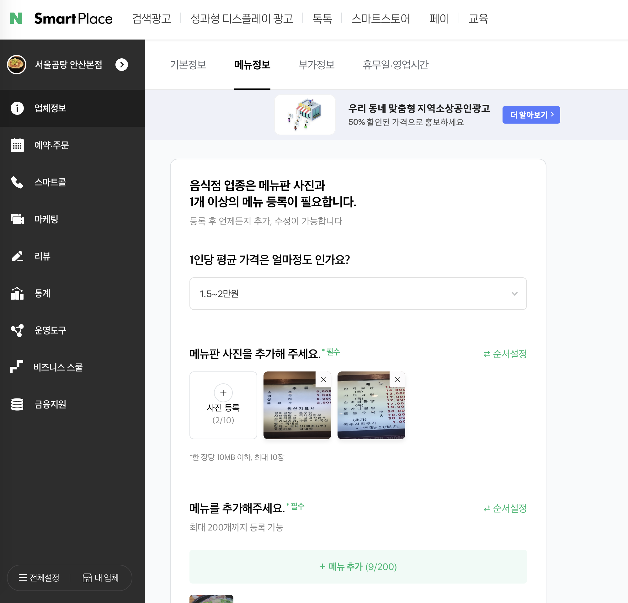 메뉴를 수정하고 반영되기까지 소요시간은 1-2일 정도 소요된다. 네이버측에서 검토후 승인이 나면 바로 적용해준다.