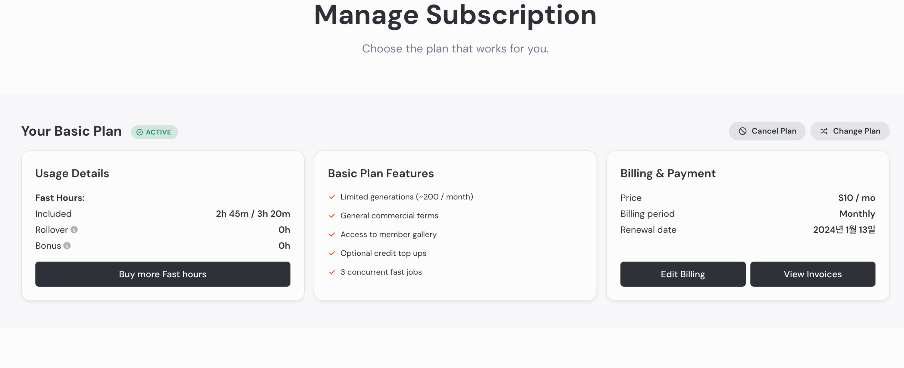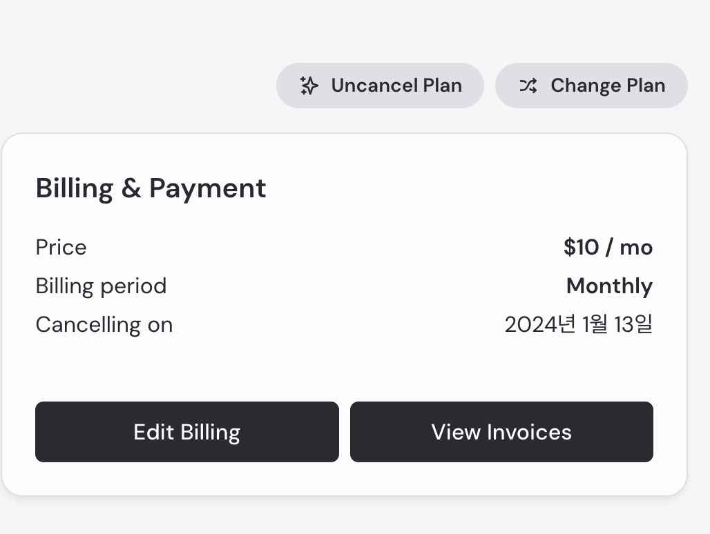만약, 다시 미드저니를 구독하고 싶으시면 Uncancel Plan 이란 버튼을 누르면 됩니다.