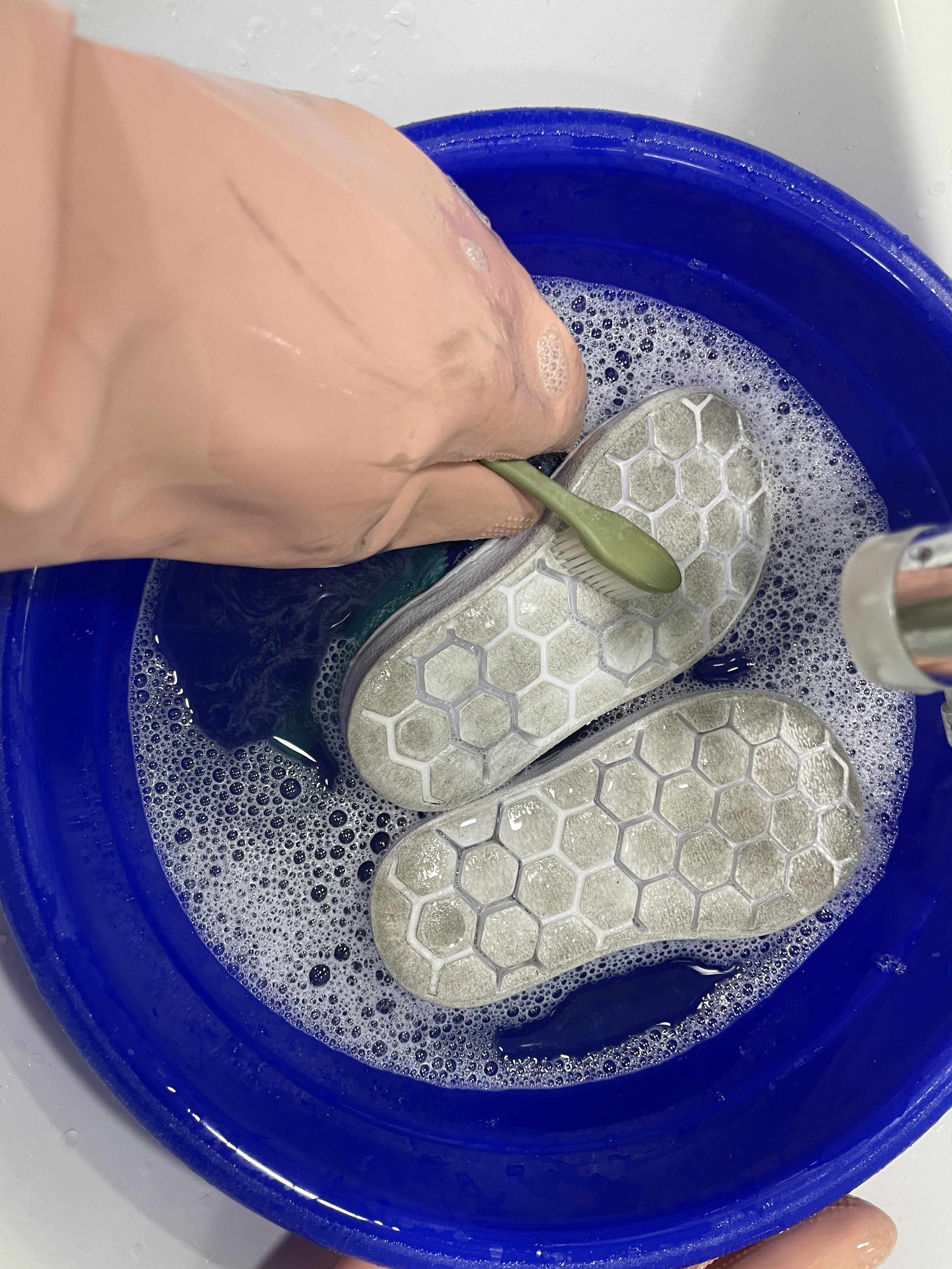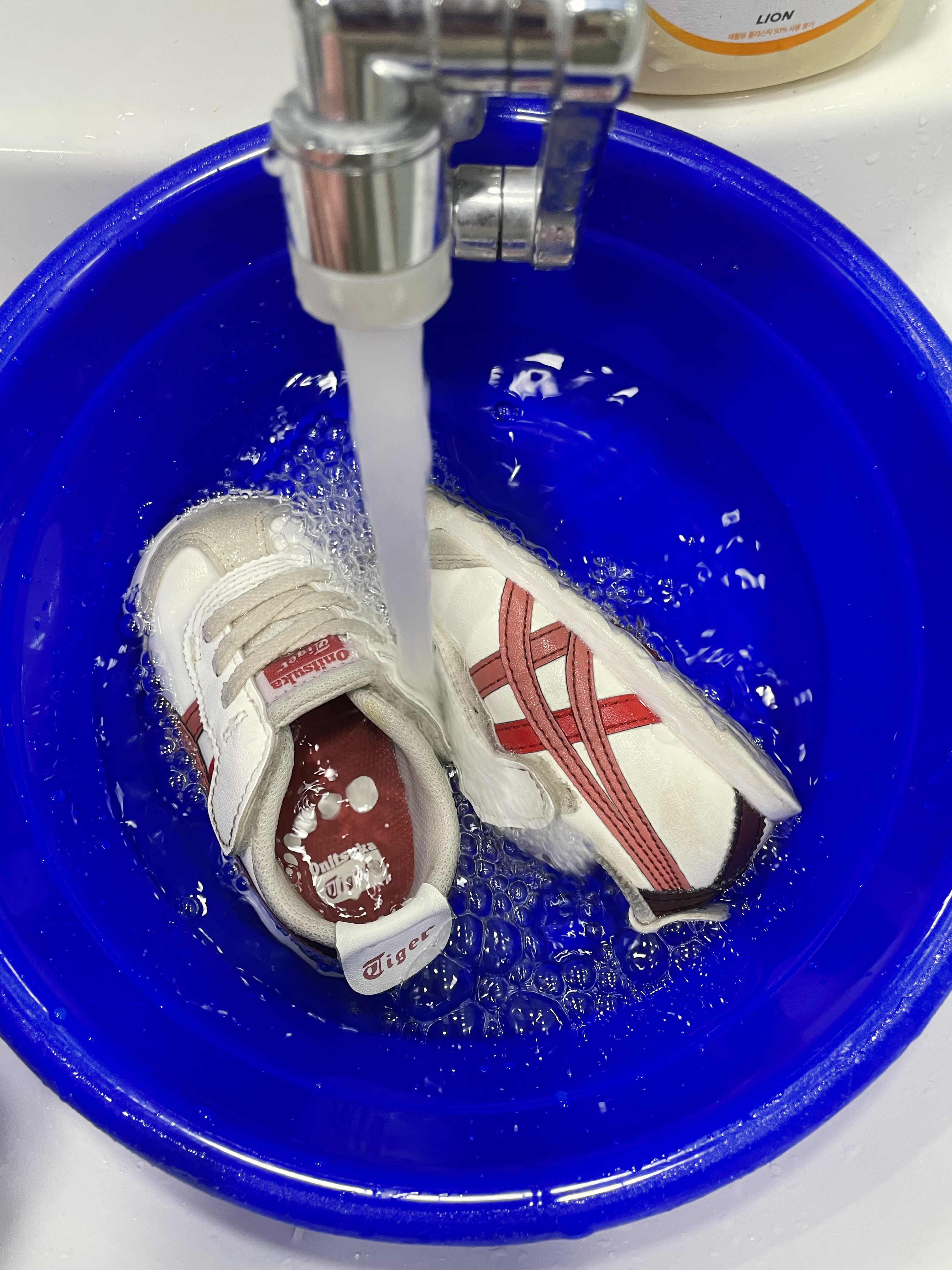 1. 아기세재 또는 중성세재를 미지근한 물에 풀어서 신발을 담근다.(10분정도)