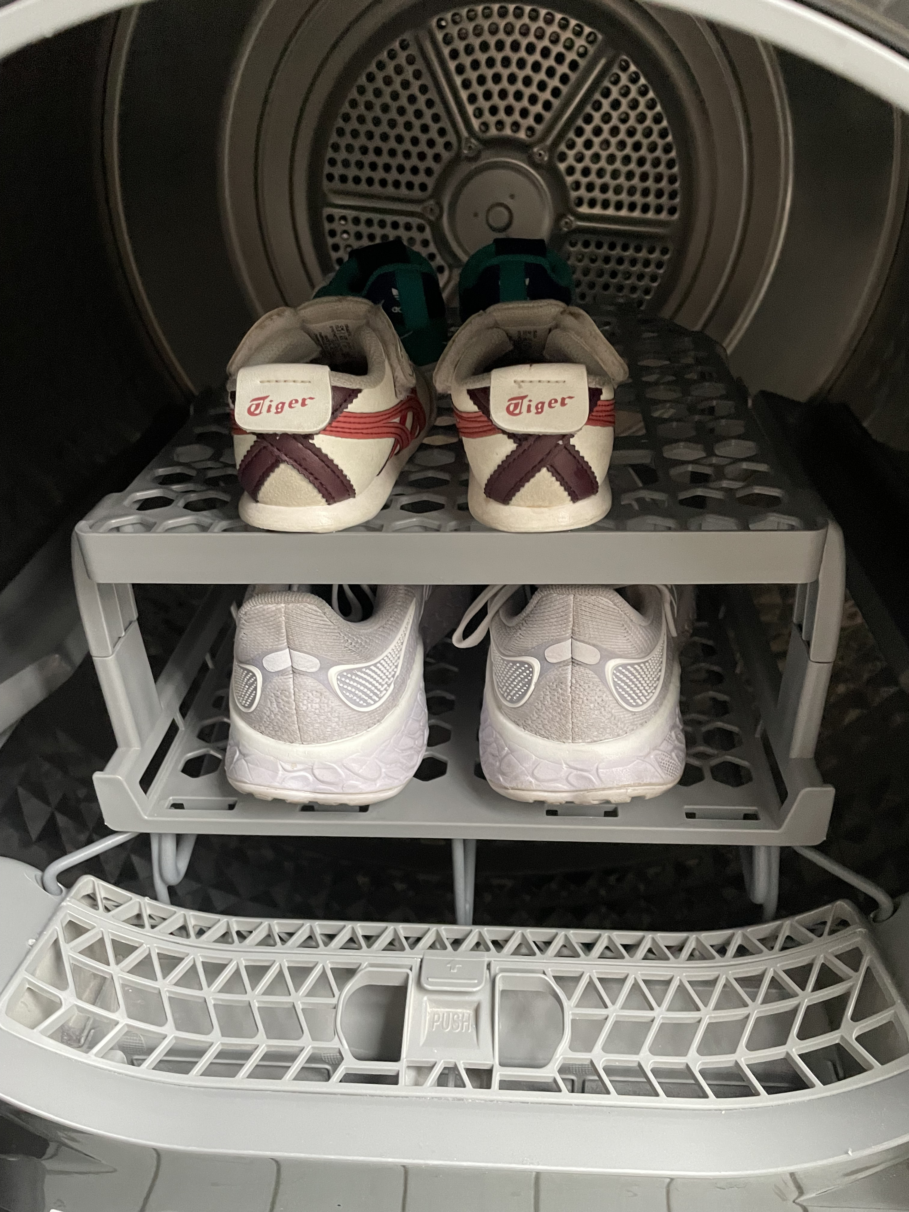 건조기를 돌리고 나온 나름 뽀송뽀송한 신발 ~ 지퍼백이 아니라 그냥 대야에 담궈서 하기도 했고 과탄산소다를 사용하지 않았어서 그런지