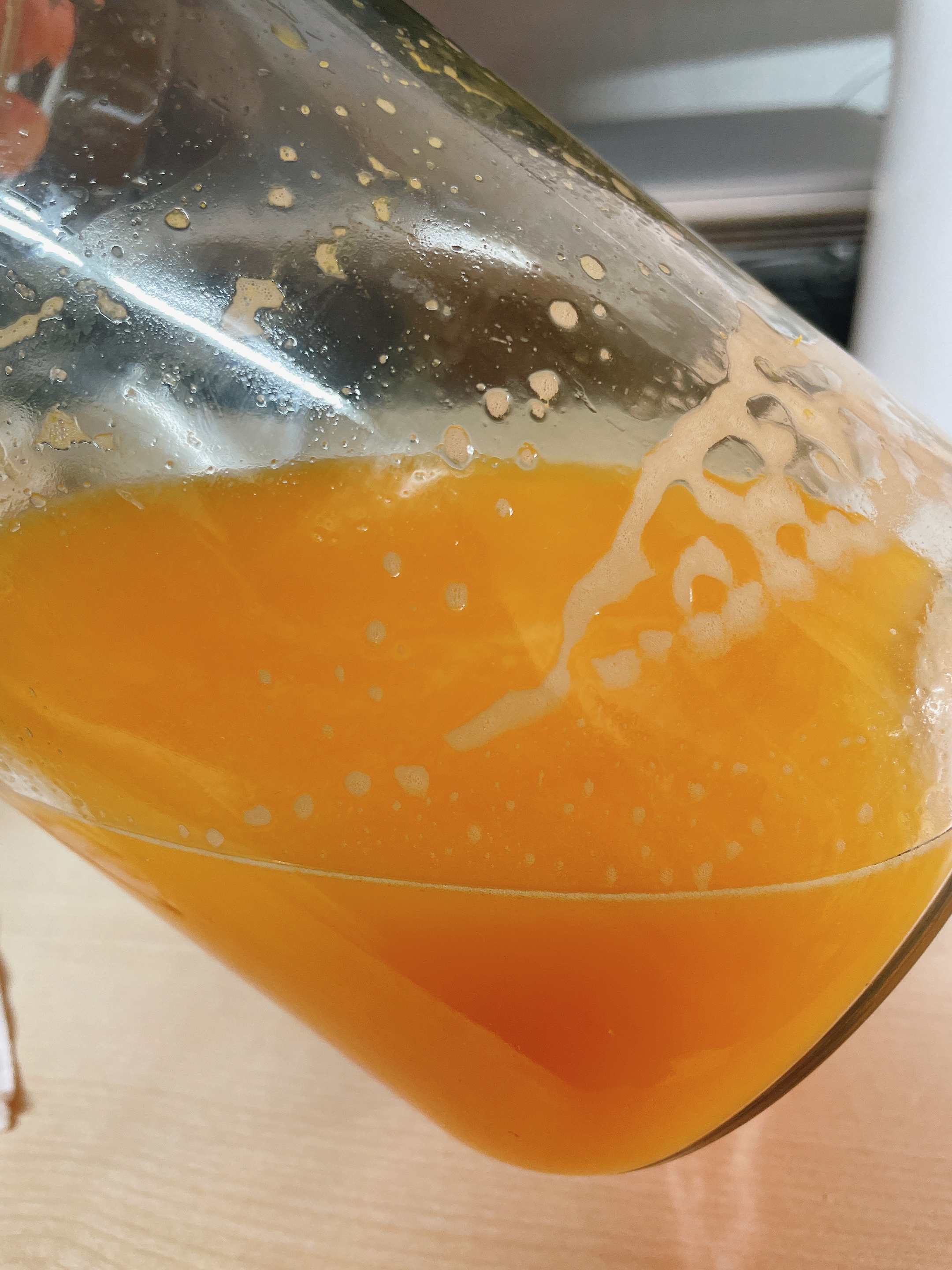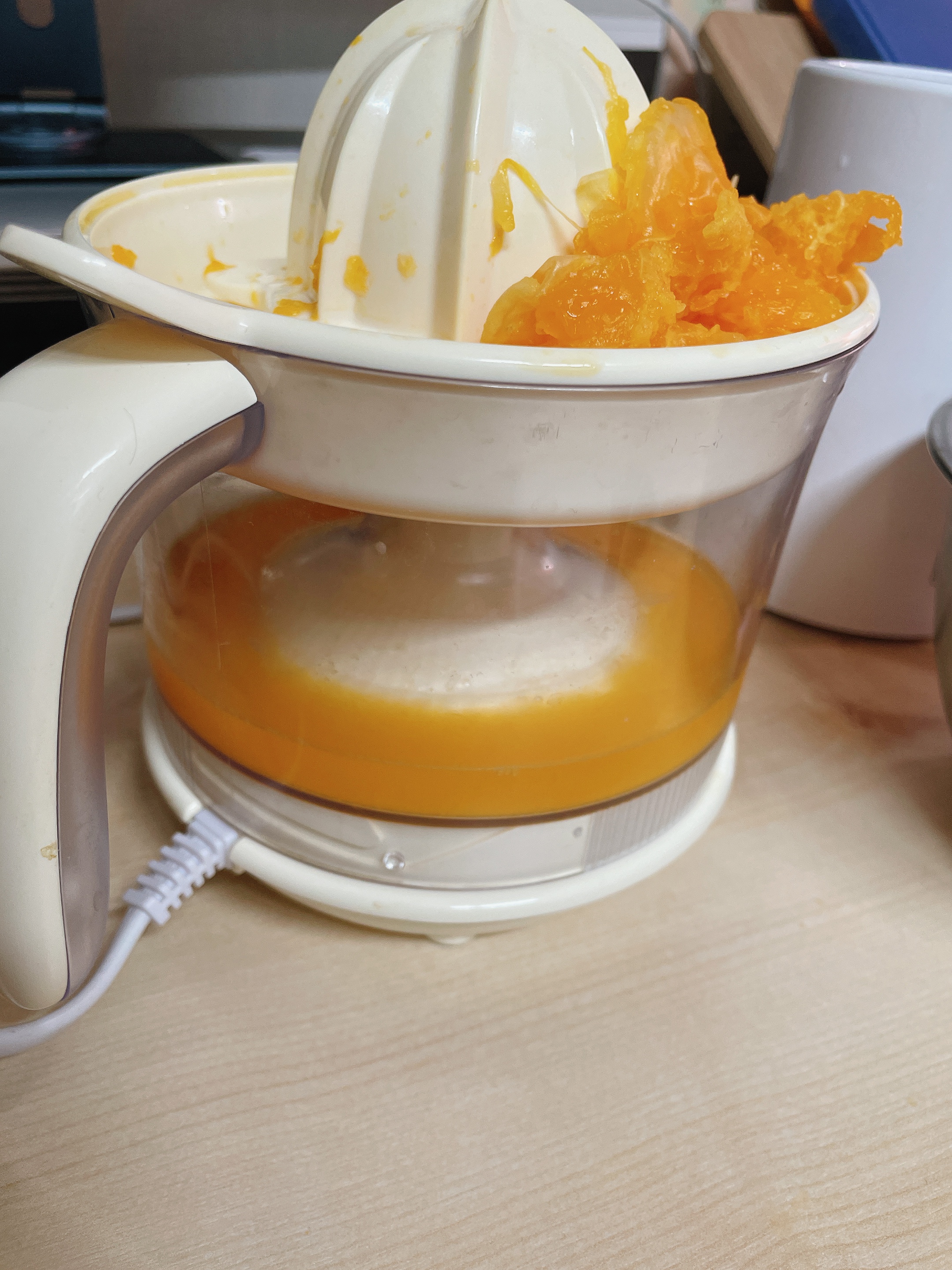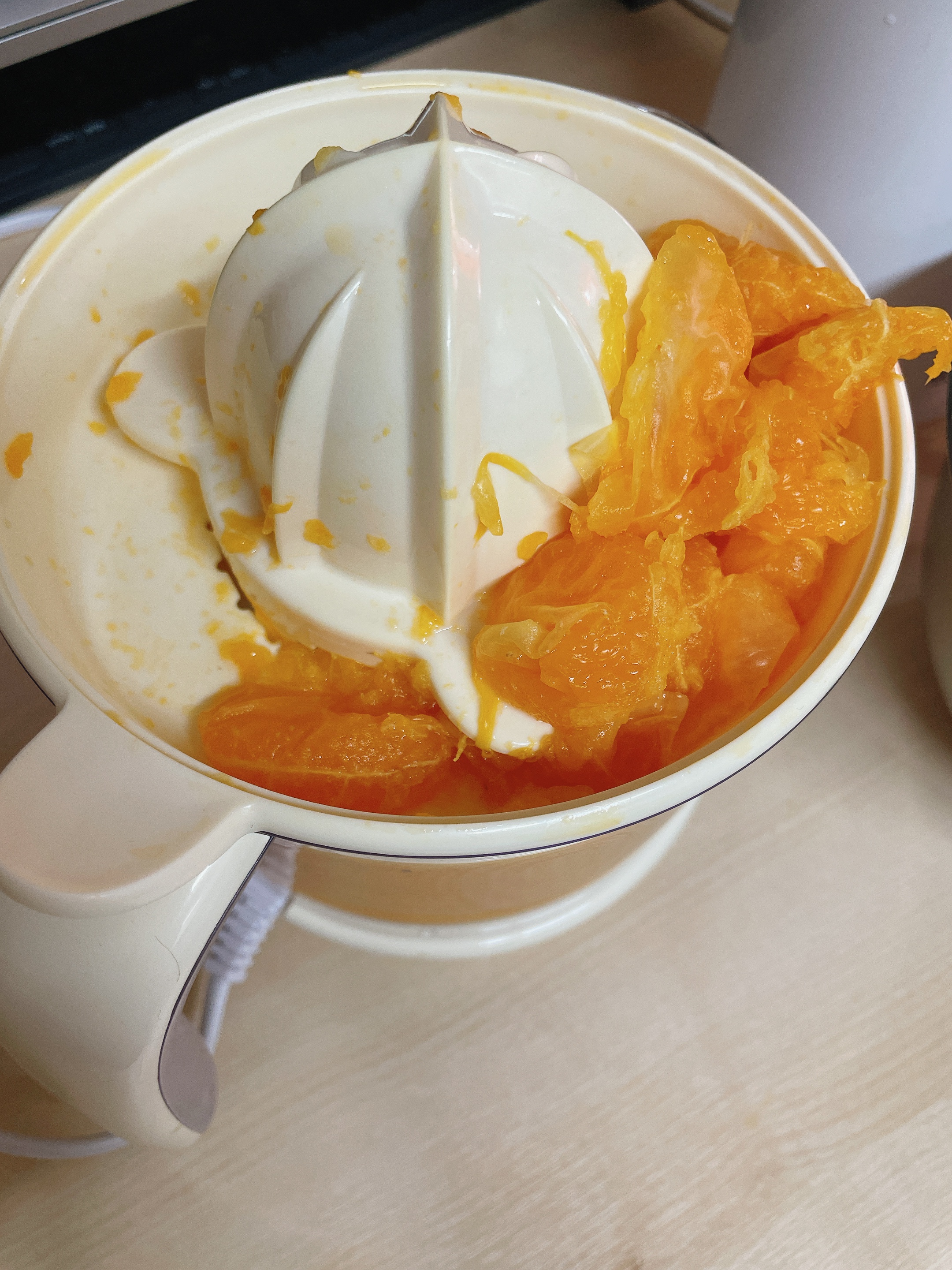 귤에 있는 즙이 빠져나갈때까지 꾹꾹 눌러주면 귤 주스의 형태가 점점 갖춰진다.