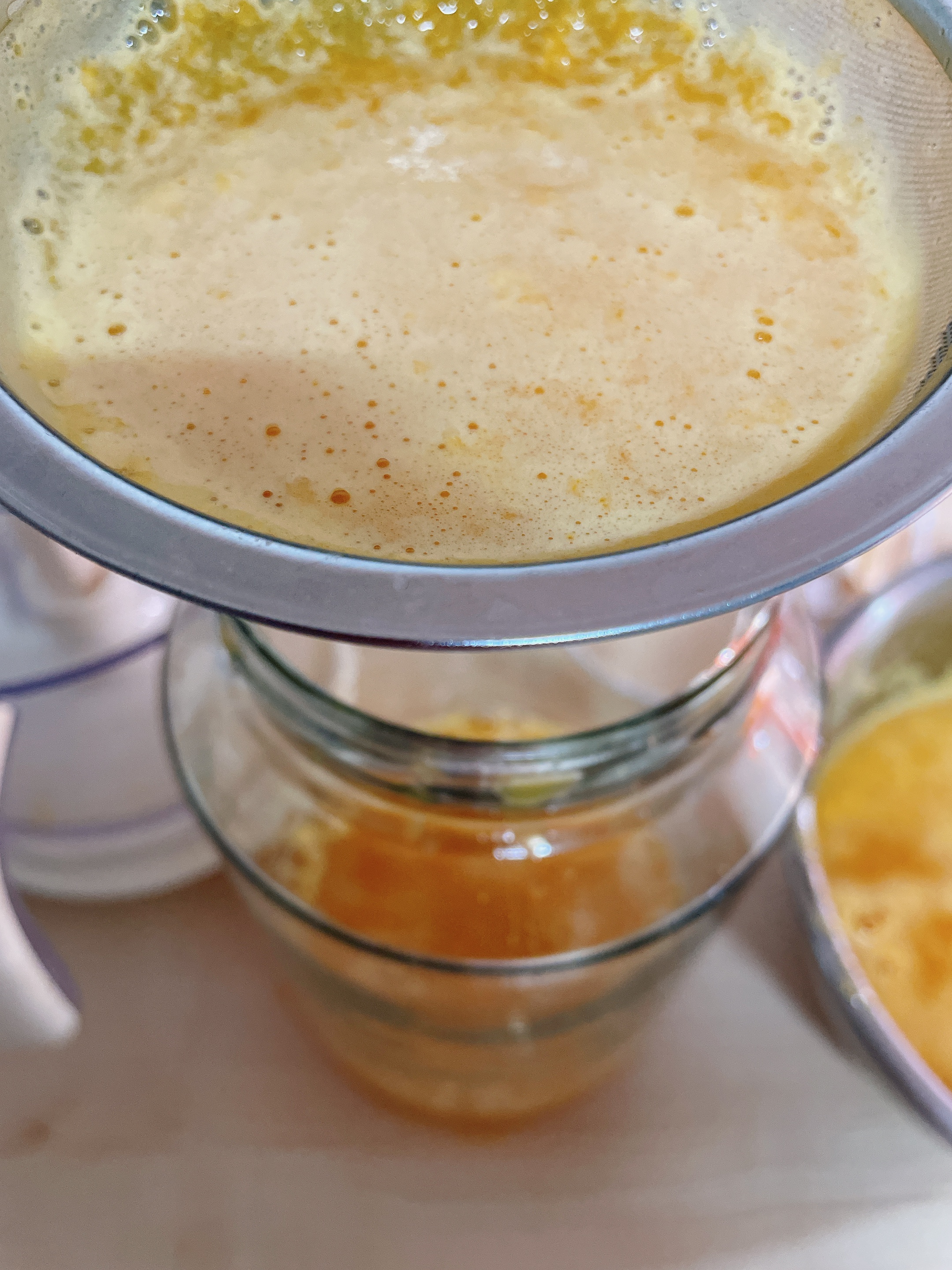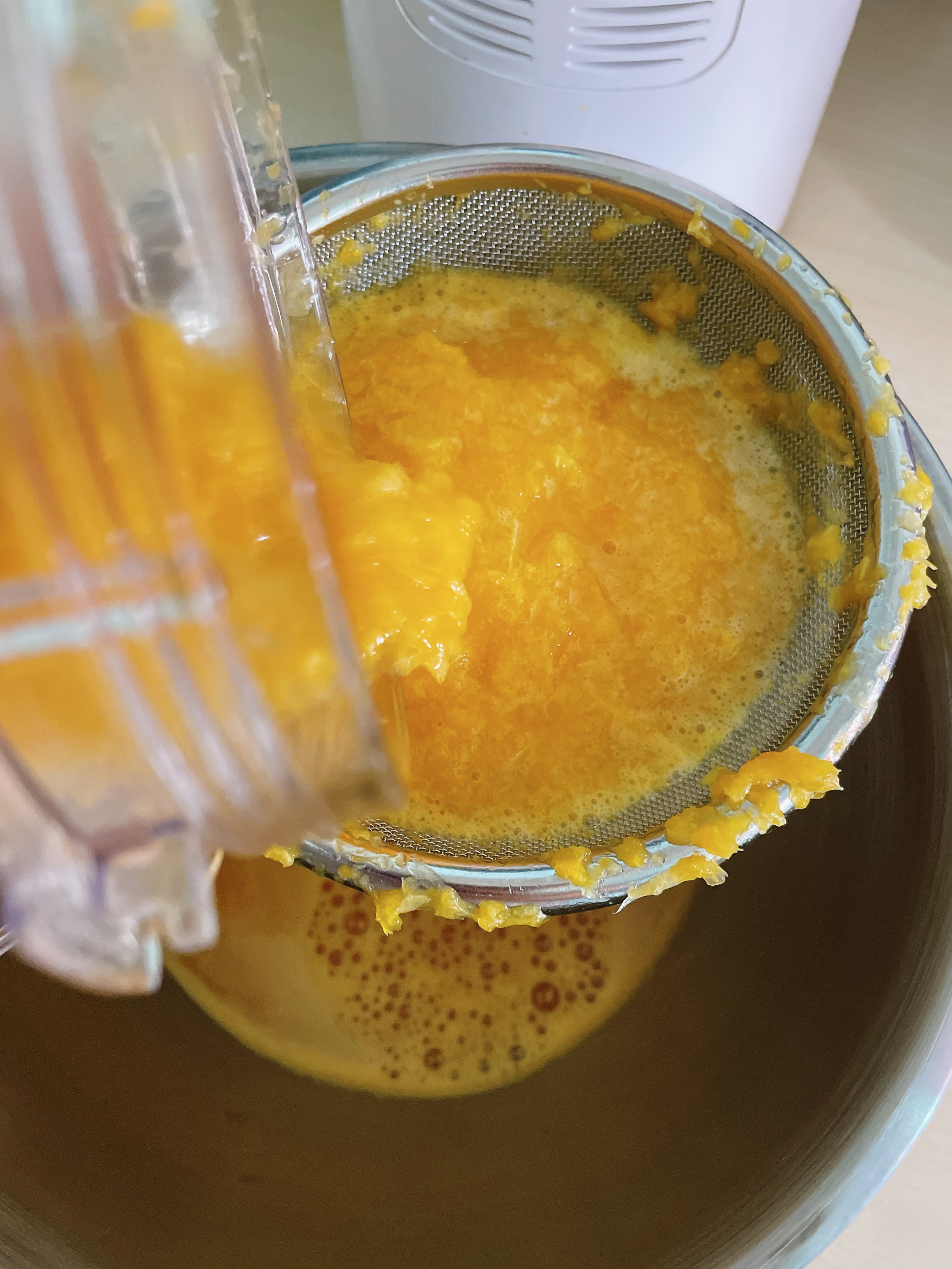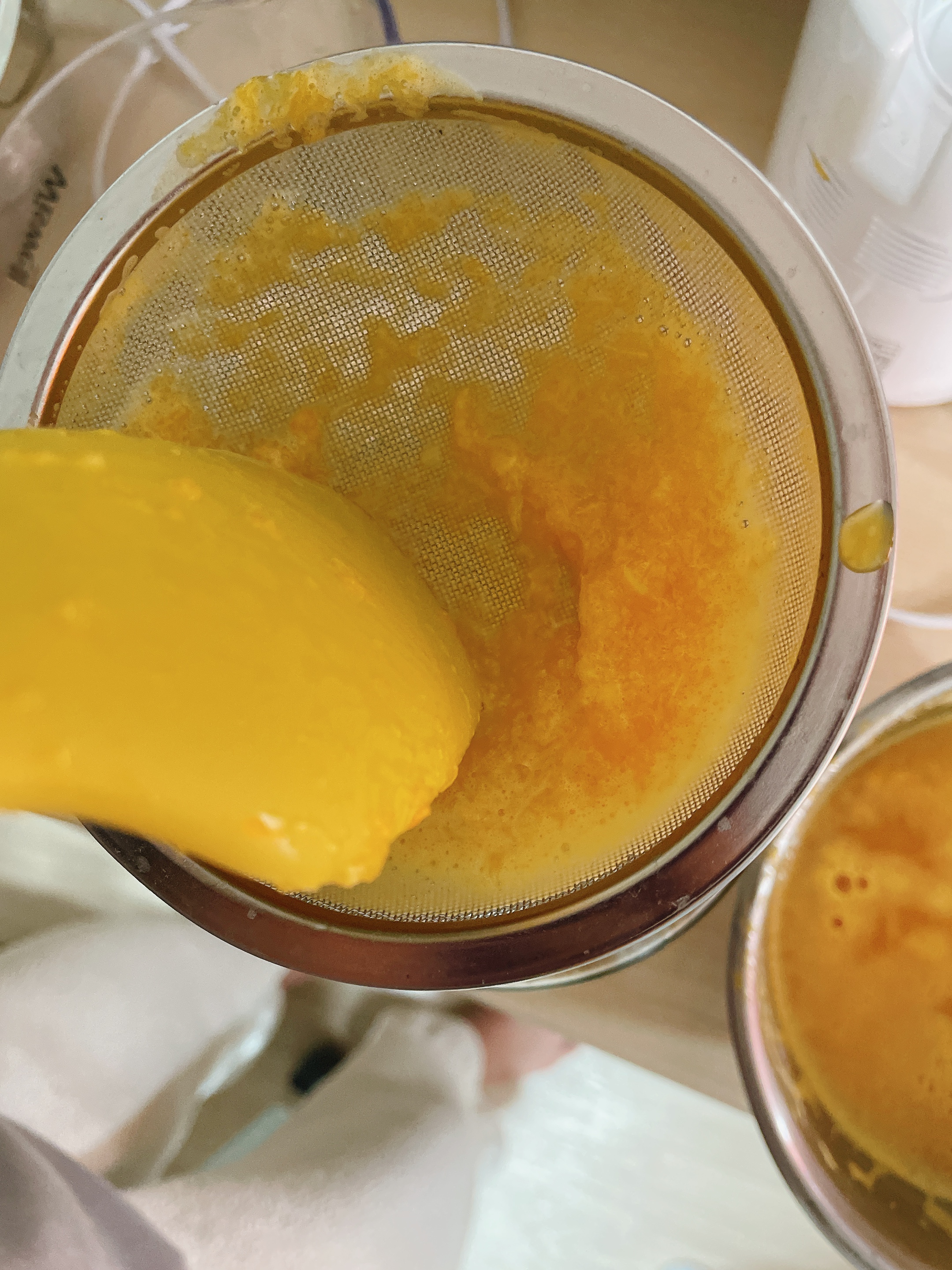 귤을 갈고 거름망에다가 조금씩 따라주면서 걸러준다. 이렇게 계속 반복해서 1차 거름 완성!