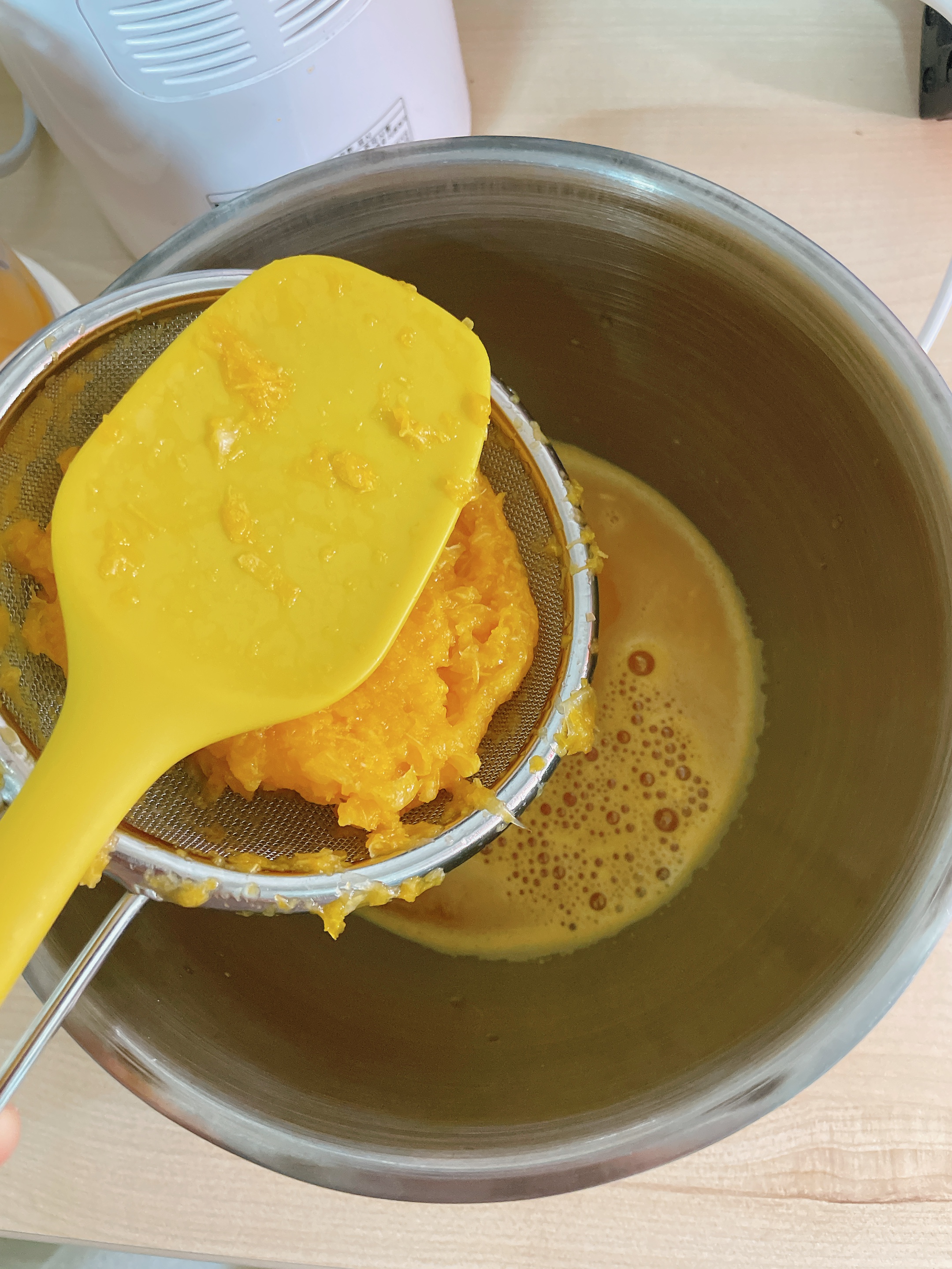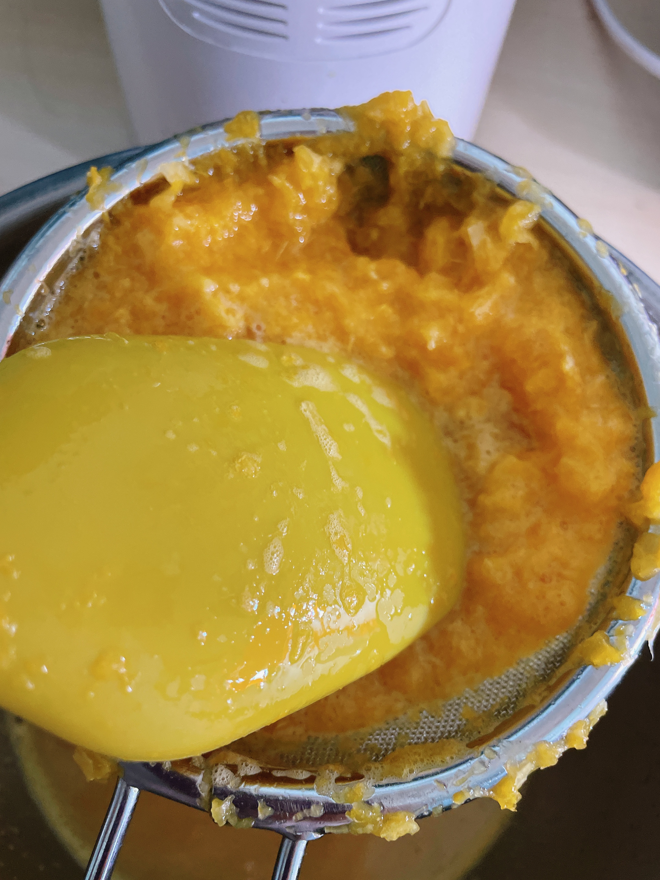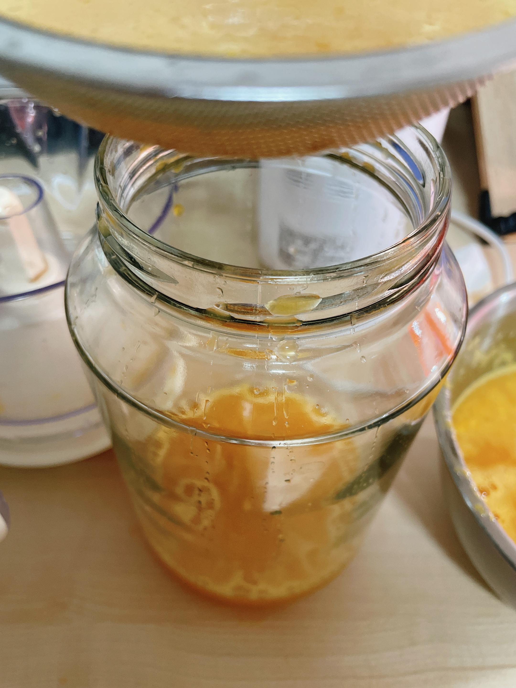 귤을 갈고 거름망에다가 조금씩 따라주면서 걸러준다. 이렇게 계속 반복해서 1차 거름 완성!