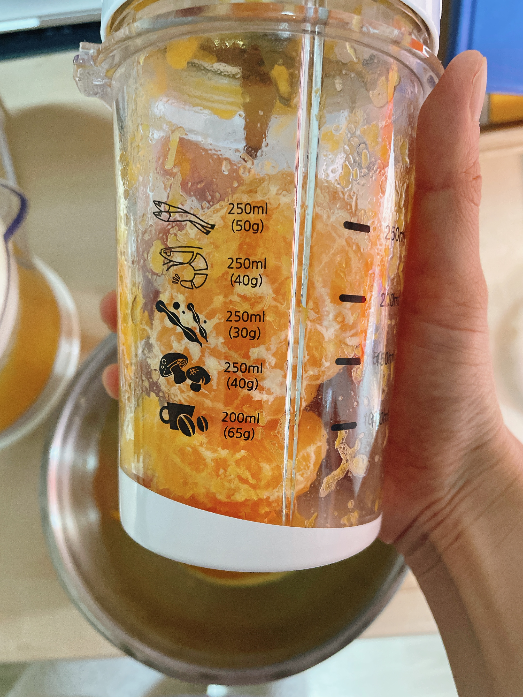 작은 믹서기에다가 갈아준다. 물은 따로 안넣어도 된다. 귤에 수분이 가득하기때문에 엄청 잘 갈린다.