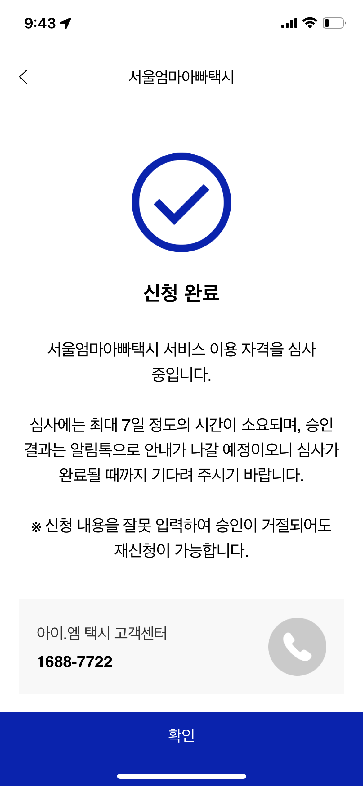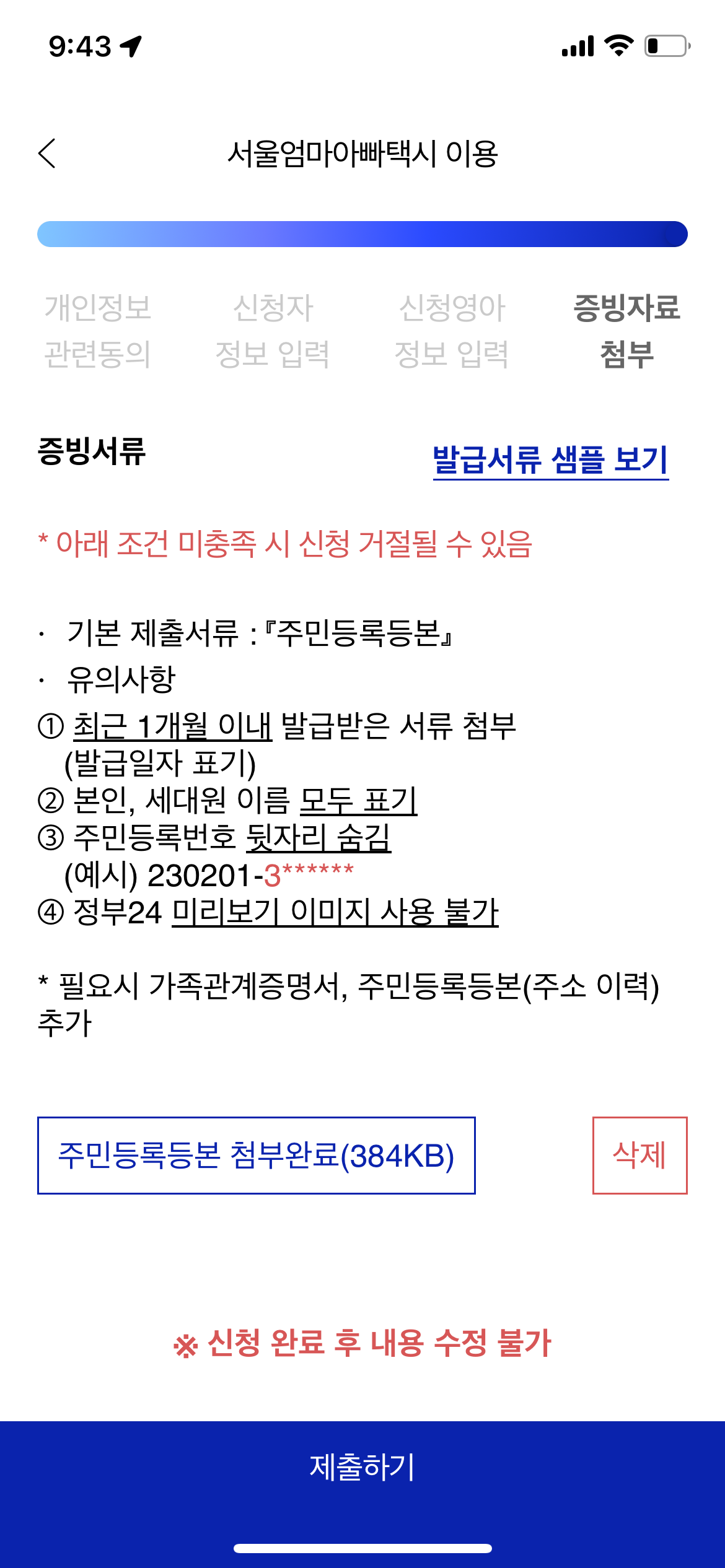 서울엄마아빠택시 이용조건에 필요한 주민등록등본만 첨부하면 신청완료 끝! 승인까지 최대 7일 소요됩니다.