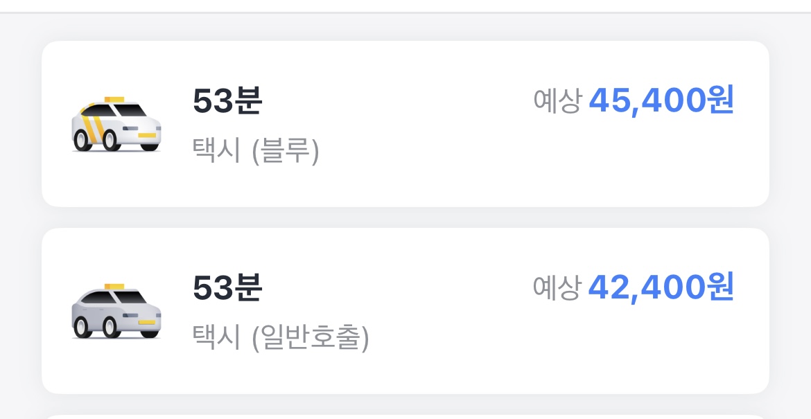 카카오택시와 비교했을때 2천원정도 차이나는데, 일반택시가 호출 안되는경우가 많아 오히려 블루로 했을때는 카카오택시 블루가 더 비싸다.