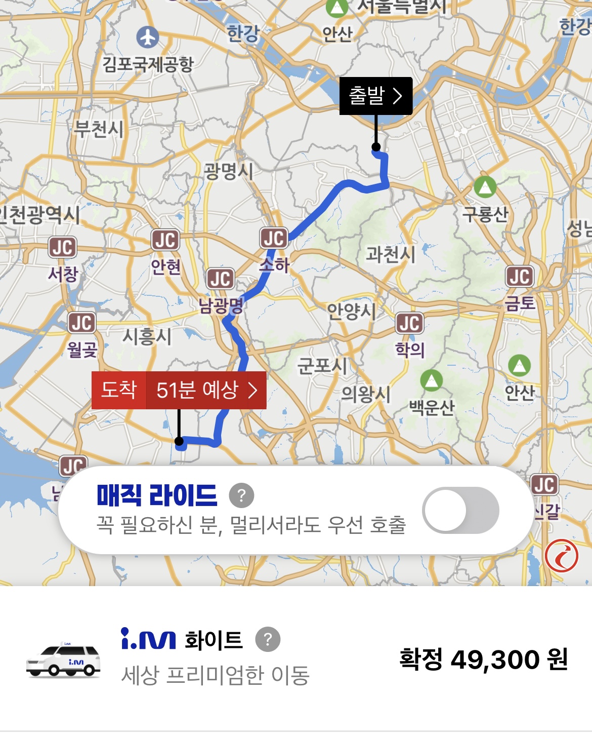 서울 - 안산 아이엠택시는 49,000원 정도 인데 실제 결제 가격은 44,000원 이였다.