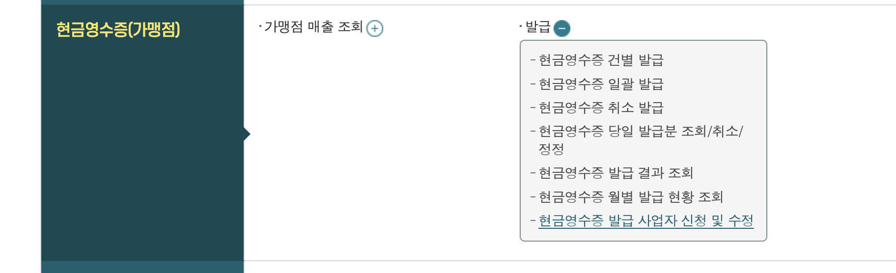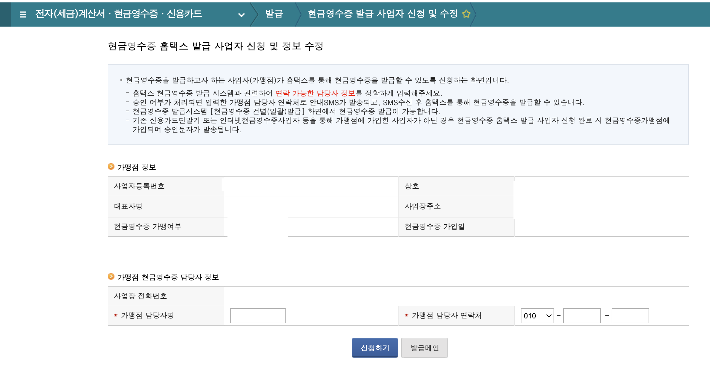 현금영수증(가맹점) - 발급 - 현금영수증 발급 사업자 신청 및 수정 에 들어간다.