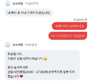 앞으로 내가 구입할때 나는 소소바람 처럼 처음보는 웹사이트에서 구매하지 않으려한다. 고객센터 전화번호가 있어도 모두 채팅만 가능한곳은 AS문제가 생겨도 대처가 미흡하고 구입한 사람만 속이 끓는다.