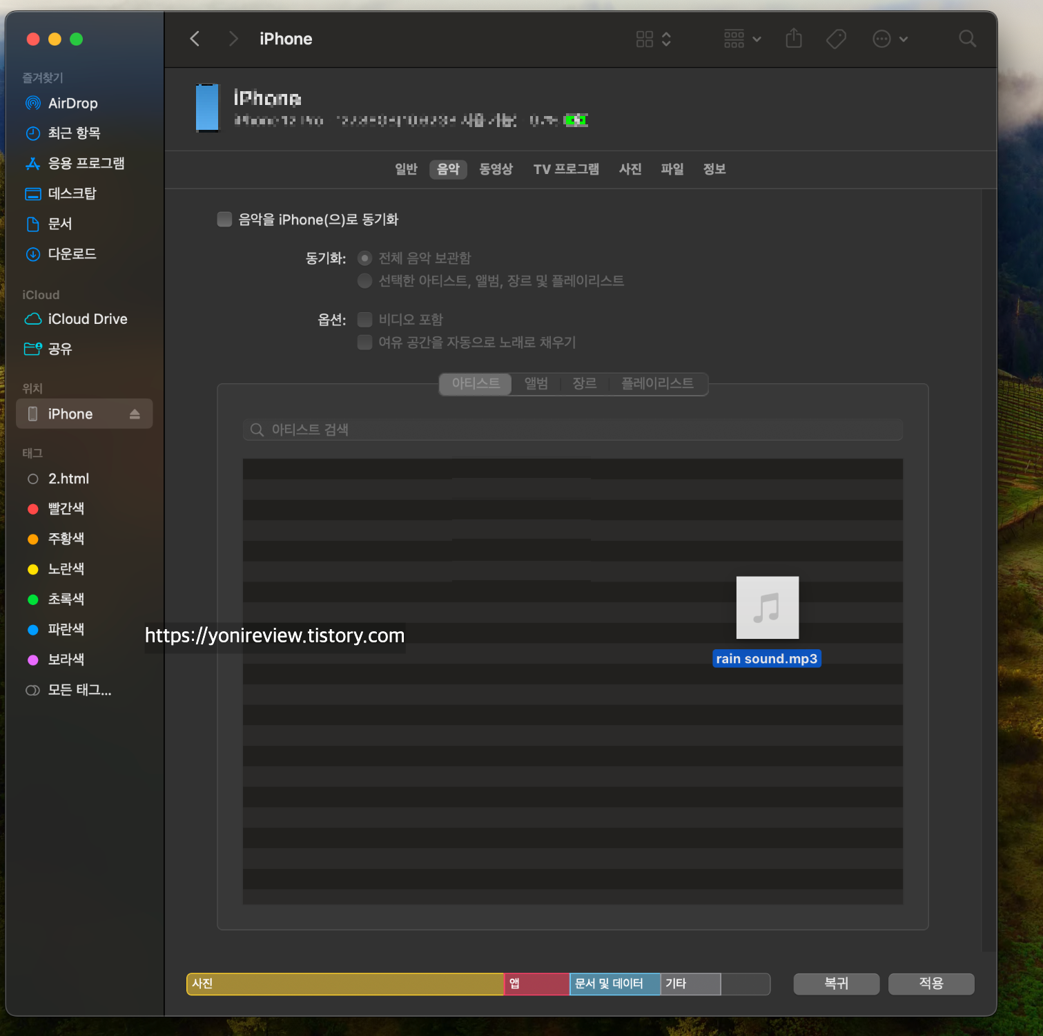 기존에 알던방법으로는 아이폰을 먼저 연결하면 나의 맥에 아이튠즈가 뜨고 거기에 삽입하면 끝. 이였는데 이제는 아이폰을 연결해도