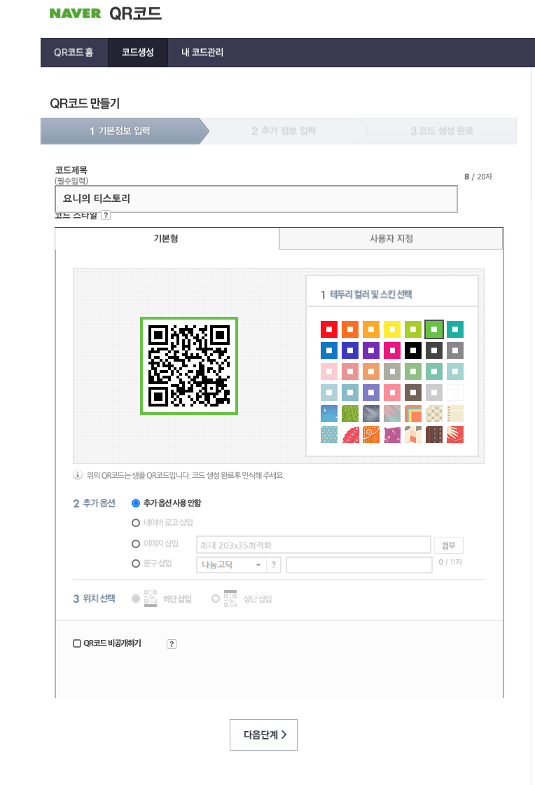 그래서 네이버에서 제공하는 네이버 QR 코드 생성기를 통해서 만들어 보았는데요.
