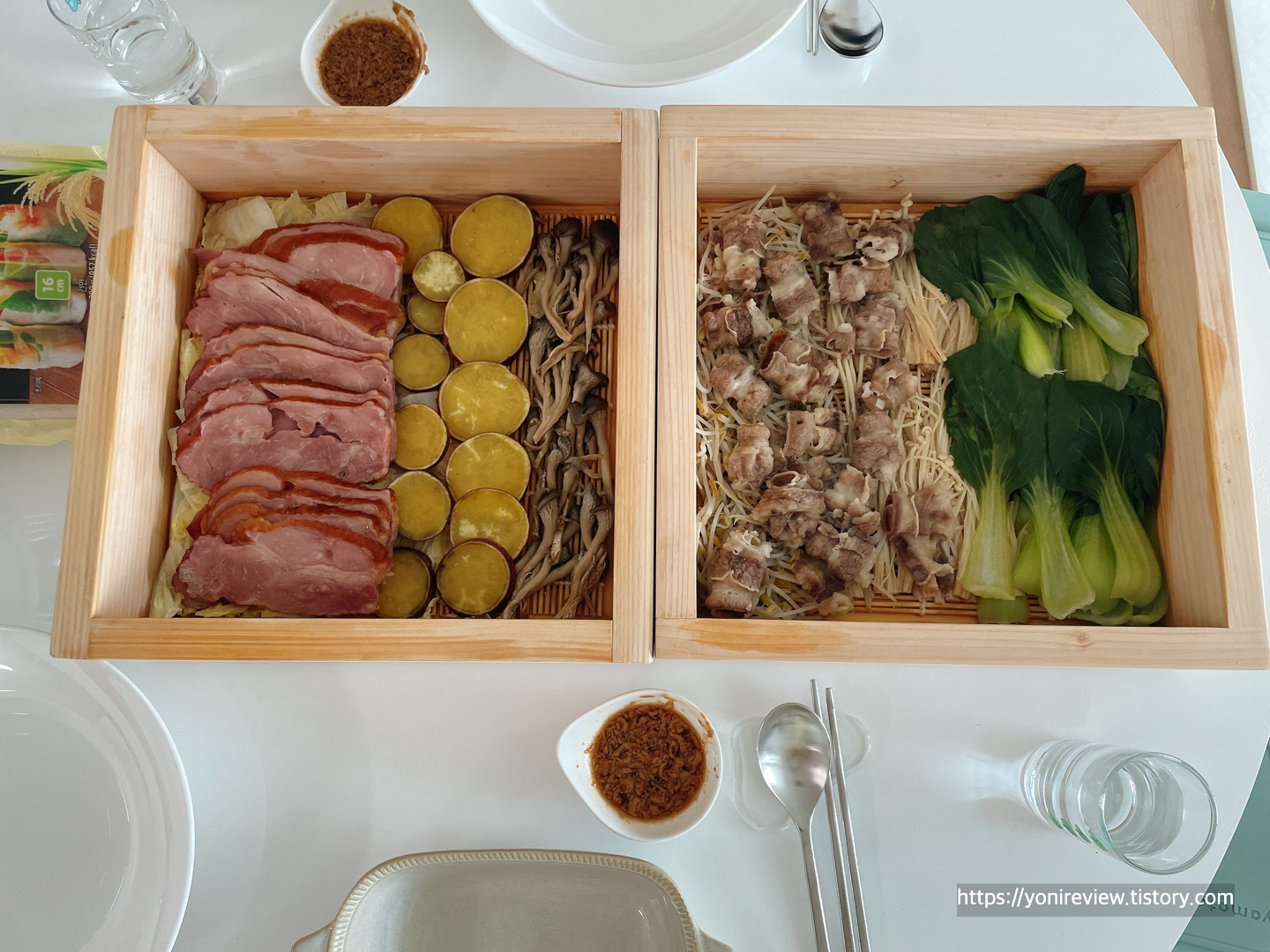 우리집에 손님이 왔다.친한 대학교 친구가 멀리서 우리집에 온다는데, 배달음식을 꺼내기도 그렇고 고민하다가 한 요리.별거 없고, 편백찜기만 있으면 모두가 다 할 수 있는 편백찜.편백찜의 가장 귀찮은 점은.재료를 사고, 사고난 뒤에 정성스럽게 자르고 씻어준다는것 외엔 몹시 간편한 요리.숙주, 버섯, 청경채 , 알배추, 고구마, 느타리버섯 등등 채소들을 예쁘게 썰어주고 가저런히 정리해준다.채소손질만 다해도 80%는 성공인 요리.친구가 올려면 1시간 정도 남았으므로 채소만 준비해두고 편백찜채로 냉장고에 넣어뒀다가 도착하기 10-20분전에 다하고나서 고기만 같이 올려서 인덕션에 올려두면 끝이다. 사실 주로 1층엔 고기 , 2층에는 해산물을 넣고 편백찜을 많이 하는데 해산물을 준비하지 못한 관계로이번엔 훈제 돼지..